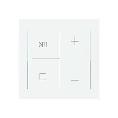 این مدل یک کاور لمسی (Labeling Field) ۴ پل دکمهای با آیکون موسیقی (Stop/Play/Volume) از سری Trevion است و خود کلید مستقل محسوب نمیشود. لمس کاربر روی این پوشش به ماژول پایه KNX منتقل میشود و بدون اتصال به ماژول، هیچ عملکرد مستقلی ندارد.