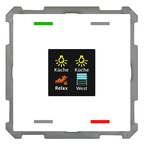 نمایشگر کلید دارای تنظیم رنگ پس‌زمینه، روشنایی و نمایش دما و ساعت می‌باشد و با استفاده از مالتی‌تاچ و دکمه‌های مکانیکی امکان کنترل چندین عملکرد همزمان و اجرای سناریوهای هوشمند را فراهم می‌کند. با باس کوپلر داخلی، اتصال به سیستم KNX به‌سادگی و بدون نیاز به منبع تغذیه اضافی انجام می‌شود.