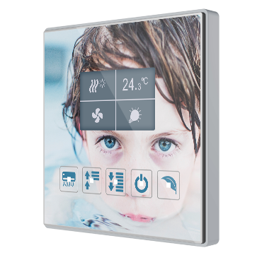 پنل دارای شیشه‌ای مقاوم و کاملاً قابل سفارشی‌سازی است؛ می‌توانید تصاویر، آیکون‌ها، متن یا لوگوهای دلخواه خود را چاپ کنید تا هارمونی و زیبایی بصری فضا حفظ شود. ترموستات داخلی و سنسور دما، همراه با ورودی‌های آنالوگ/دیجیتال چندمنظوره، امکان اتصال سنسورها، کلیدها و تجهیزات جانبی هوشمند را می‌دهد.