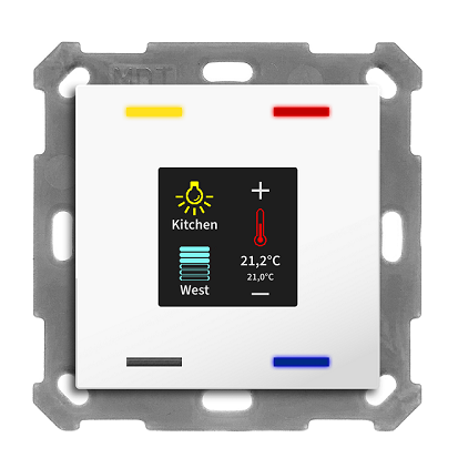 کلید Push Button Smart 55 از برند MDT یک کلید هوشمند پیشرفته KNX است که مجهز به سنسور دما و رطوبت داخلی میباشد. این دستگاه دارای ۴ کلید مکانیکی با عملکردهای چندگانه و صفحهنمایش رنگی فعال برای مشاهده وضعیتها (دما، رطوبت، زمان و عملکرد سیستمها) است. این کلید امکان کنترل یکپارچه روشنایی، پردهها، شاترها، سناریوها و تهویه از طریق سیستم KNX را فراهم میکند.